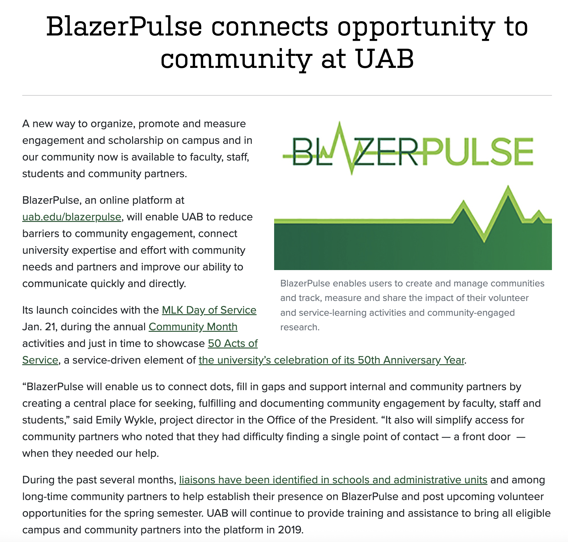 UAB launched BlazerPulse in January 2019 as a centralized online platform connecting students, faculty, staff, and community partners across Birmingham. Developed through the Office of the President, the platform serves as the university's hub for organizing, promoting, and measuring community impact across volunteer activities, service-learning courses, and community-engaged research initiatives.Strategic Challenge